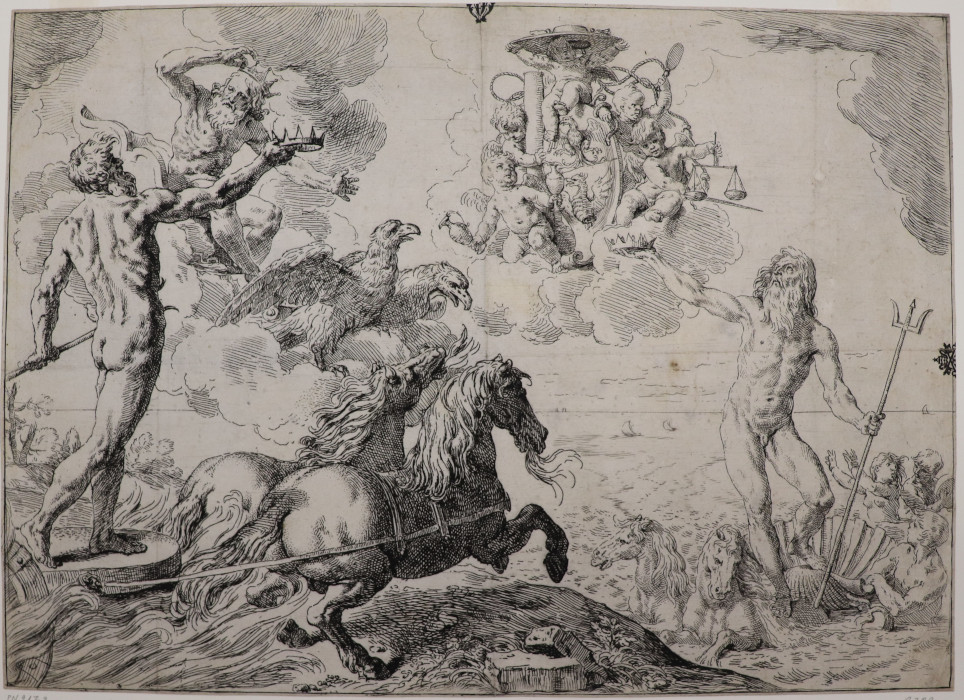 Giove, Nettuno e Plutone fanno omaggio delle loro corone alle armi del cardinale Borghese