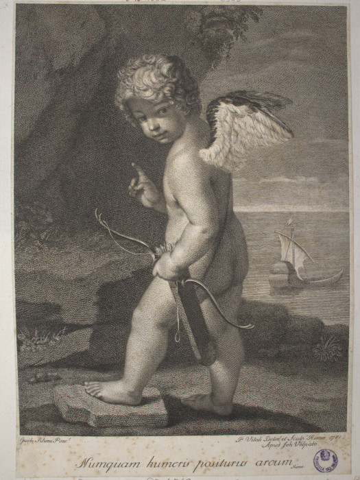 nel margine a sinistra: Guido Rhenui Pinx; a destra: P. Vitali delin. Et sculp Romae 1781 / Apud Joh. Volpato; sotto al centro: Numquam humeris positurus arcum. / Horat: