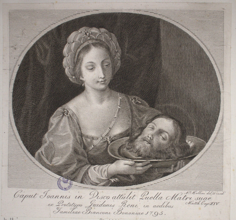 Nel margine a sinistra: N. Mellini ded. Et incid/ al centro: Caput Joannis in Disco attulit Puella Matri suae / Matt: Cap. XIV / ex Prototypo Guidonis Reni in aedibus / Familiae Bianconi Bononiae 1795.