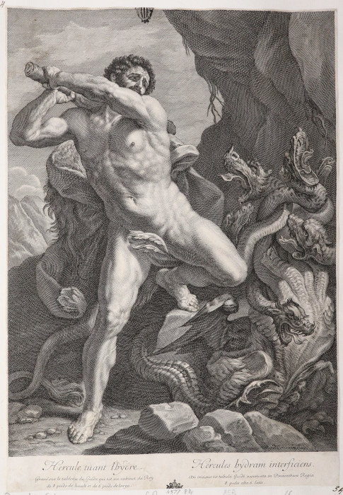 In basso a destra: …; nel margine a sinistra: Hercule tuant Ihyere / …; nel margine a destra: Hercules hydram interficiens / …