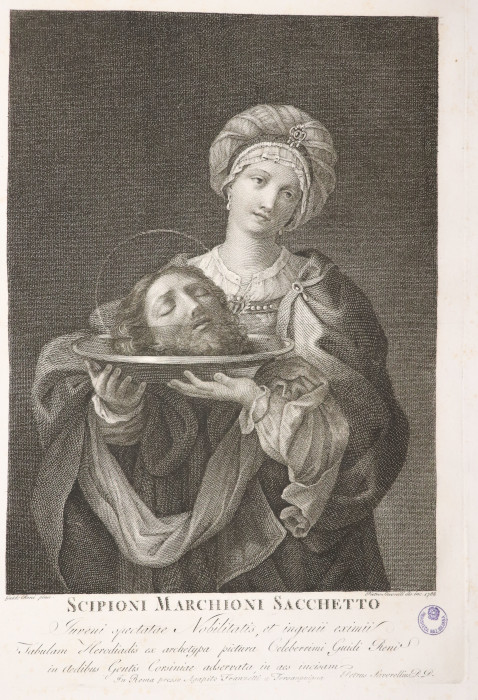 Nel margine a sinistra: Guido Reni …; a destra: Pietro Savorelii… 1788; / al centro: SCIPIONI MARCHIONI SACCHETTO / Iuveni spectatae Nobilitatis, et ingenii eximii / Tabulam Herodiadis ex archetypa pictura Celeberrimi Guidi Reni / in aedibus Gentis Corsiniae adservata in aes incision / ...