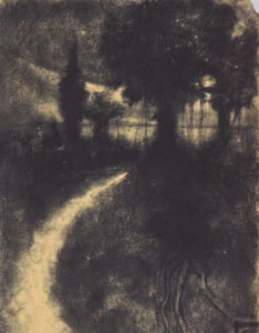 Ho davanti a me Sui tuoi passi, silente paesaggio notturno eseguito a carboncino su carta intelata (fig. 3) [4]Omar Galliani, Sui tuoi passi, carboncino su carta intelata, 1986, cm. 220x125. Il disegno è stato esposto nelle mostre L’opera al nero 2014, e in Galliani incontra Morandi 2014. in cui Omar Galliani sostanzia per mezzo di un enigma la propria idea di Natura, nucleo tra i più significativi in un codice stilistico e poetico connotato da molteplici declinazioni e assoluta coerenza. Come avverrà in modo continuativo negli anni successivi, muovendo dal paesaggio “interiore” di origine classica, qui Galliani rappresenta una Natura sacra dove hanno origine e risonanza sentimenti addensati nel folto di una riplasmata “maniera nera”, che nell’educazione tecnica e visiva del nostro Artista scaturisce dallo studio della storia dell’incisione e del disegno da Vasi a Piranesi, da Goya a Redon, da Seurat a Kubin, da Gino De Dominicis a Claudio Parmiggiani… E mentre il fuoco nero di cabala del carboncino, la “luce senza bagliore” di cui in Libro d’ombra scrive Junichiro Tanizaki, si espande in un umido notturno e siderale, si assiste alla tenebra ritmica nella trama dei segni, alla quiete di sagome di alberi oscuri lontani nella notte estiva, trapunta di balenii di lucciole e stelle. Come in un sogno, un brivido di luce, un sentiero a forma di falce di luna s’innesta nel velluto della terra combusta di fusaggine. È qui, sul sentiero che sale verso il bosco, una traccia mnestica, enigma con singole lettere che in processione compongono le parole “sui tuoi passi” [5]Per l’immissione di alfabeti nel lavoro di Galliani si veda Croquis de voyage 2015.. Scrive Elémire Zolla in Aure, libro assai caro a Galliani, che veglia e sogno non sono diversi, ma hanno eguale realtà, un assunto esoterico oggi confermato peraltro dalle neuroscienze, così “sui tuoi passi” assume i contorni di un’evocazione nella connessione di passato e presente e nella conseguente delineazione di un futuro. .